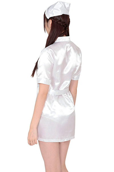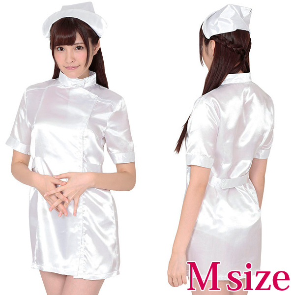 男女問わず、誰もが一度は憧れるナースのコスプレ衣装!キラキラとした純白生地の光沢感がとってもキレイで、セクシーなミニスカートタイプです。