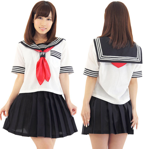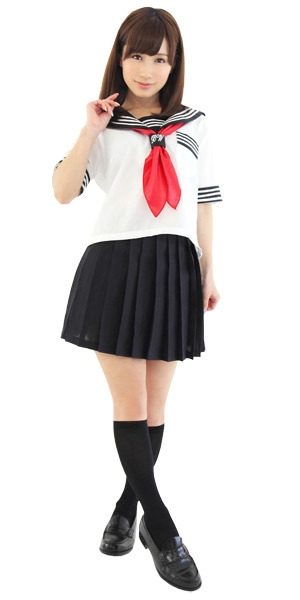 涼しげな夏服仕様の半袖タイプ!セーラー襟や袖のオーソドックスな3本ラインでリアル感を演出!ミニ丈のプリーツスカートがちょっぴりセクシーなスクール系コスチュームです。