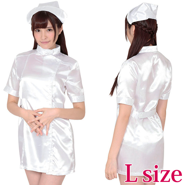 キラキラとした純白生地の光沢感がとってもキレイ!セクシーなミニスカートのワンピースとナースキャップのコスプレセットです。