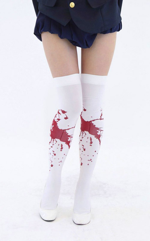 ほとばしる鮮血に思わずドキッ!飛び散るリアルな血痕がプリントされた、ホラーテイストのニーハイソックス。赤が映えるホワイトカラーなので恐怖感もバツグン!友達へのドッキリやハロウィンパーティーのゾンビ仮装にもぴったりのコスチュームです。