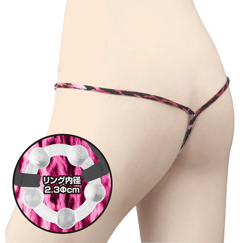 ●ローズカラーのヒョウ柄がワイルドなストレッチ紐●5つのボールを造形したクリアなシリコンリング●局部をソフトに締め付ける実用的なランジェリー。