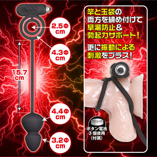 ●竿と玉袋を締め付けるダブルリング●↑早漏を防ぎ勃起持続をサポート●リング根元にマイクロローター装備●リングの先から伸びるアナルプラグ●↑前立腺を刺激し射精感もUP。