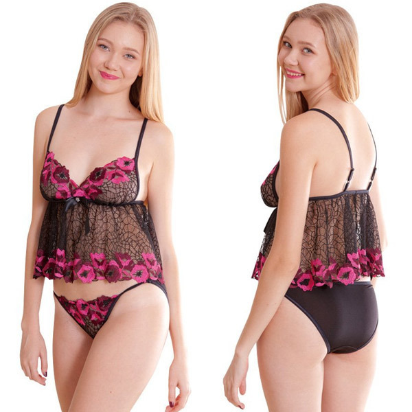 ブラックメッシュにローズカラーの花刺繍!お洒落で大人可愛いミニ丈ベビードール。
