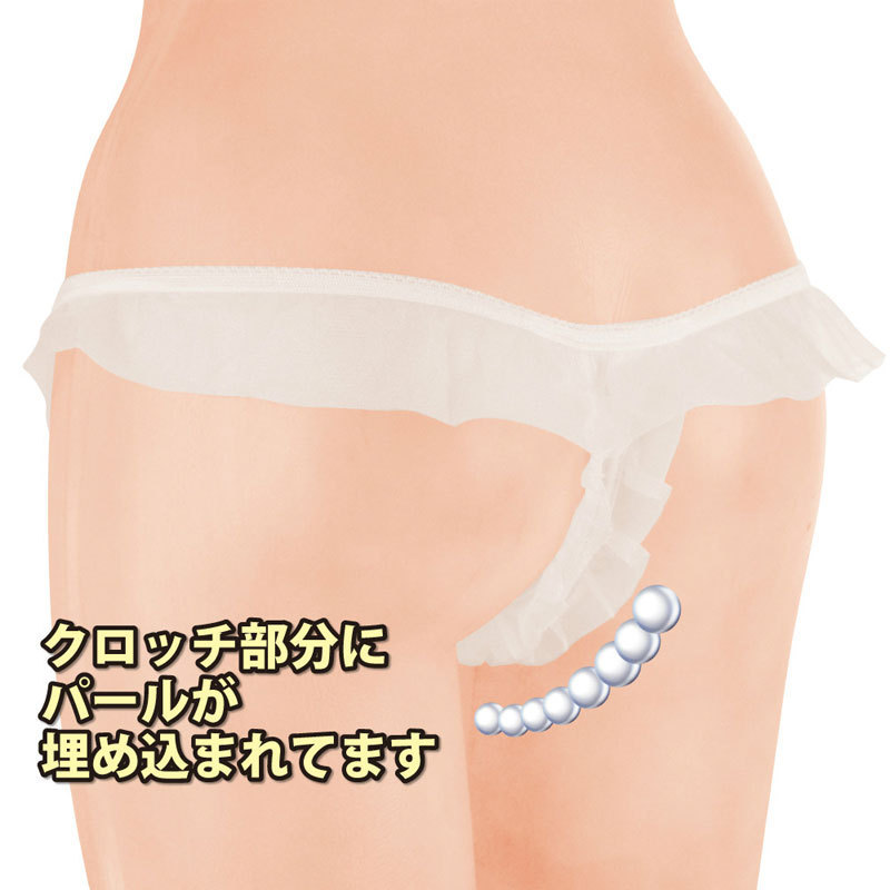 ●天使の羽のような柔らかホワイト●ウエスト周りに幅広フリルをプラス●リボン付きフロントはオープン仕様●フリルによるTバックデザイン●クロッチに大粒パール内蔵済み。