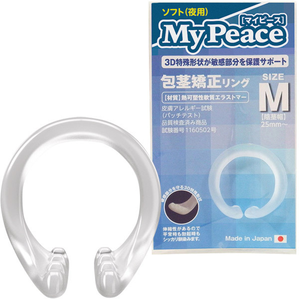●マイピース・ソフト夜用のMサイズ●着脱しやすいC型●柔軟性の高いエラストマー素材●伸縮性があるので平常時も勃起時も使用可●3D特殊形状●細かい凸凹がズレ&外れを防止●皮膚アレルギー試験済み。