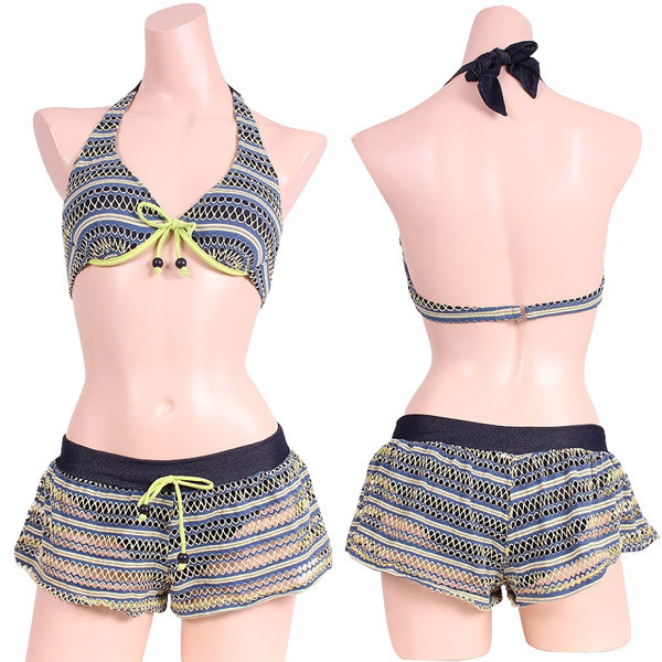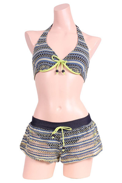 ビーチで周りと差をつける、黄緑とネイビーの本格スイムウェアシリーズ♪ショートパンツありなしで2テイスト楽しめる3点セット。