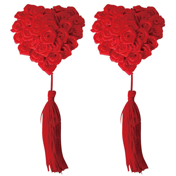 真っ赤なバラで贅沢にデコレーションしたハート型ニップルと、ゆらゆら揺れるタッセルを組み合わせたゴージャスなデザインは、ショータイムやナイトパーティーにも最適です。