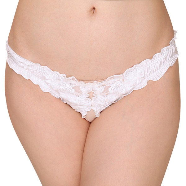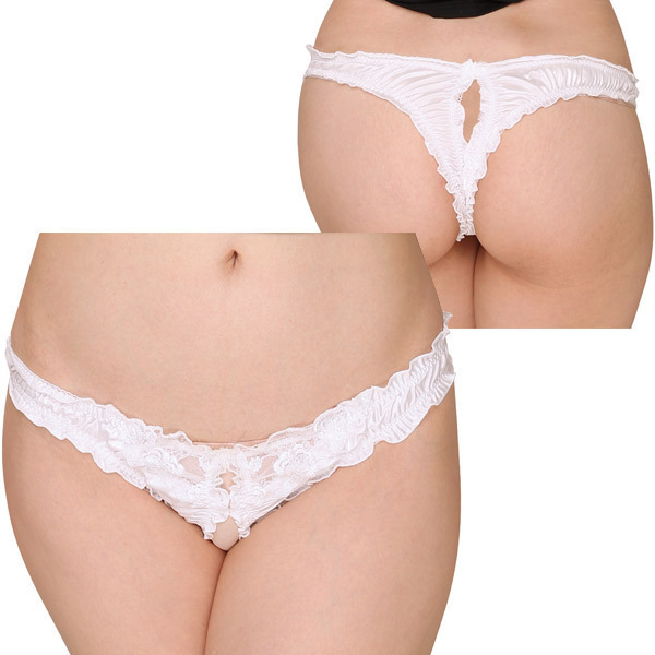 フロントにフラワーレースをあしらったエレガントなデザインショーツで、光沢感が華やかに魅せてくれています♪ホワイトカラーで清純そうに感じられますが、実は結構大胆な作りとなっていて、よく見てみるとクロッチ部分がオープンになっているというエロティック仕様。