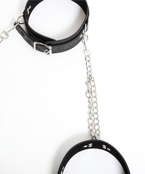 パッケージ:48.0×20.0×2.5cm 本体:首輪(55.5×5cm・ベルト穴5個)・太ももベルト(55.5×5cm・ベルト穴5個)・拘束チェーン41.0cm セット内容:首輪×1本、太ももベルト×2本、拘束チェーン×2本 素材:合皮、金具