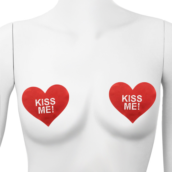 「KISS ME!」あなたの気持ちを赤いハートで伝えるニップレス。肌保護のため乳首に触れる裏面の中央部分には粘着しない素材を使用!2枚1セット※肌に合わない際はご使用をお控えください。