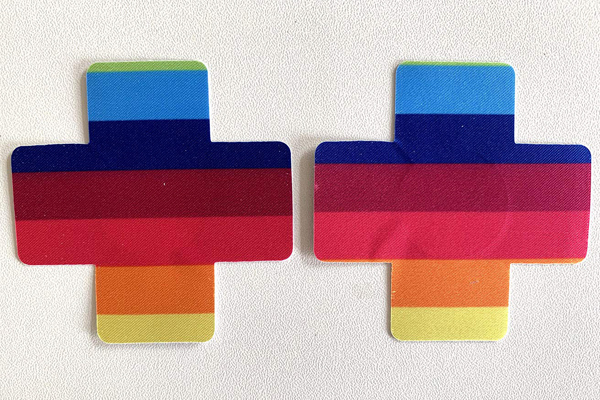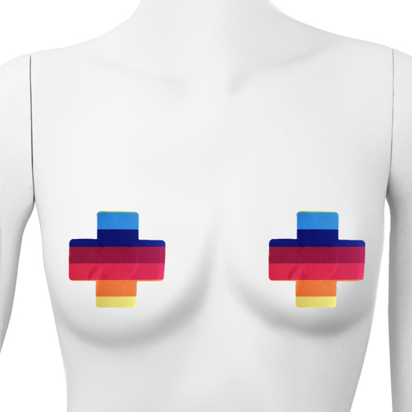 カラフルな虹が胸元を可愛く彩る十字型のニップルシール(レインボー)。擦れ、透け防止ほかオシャレアイテムとして!先端に触れる部分には粘着しない素材を使用しているので肌に優しい♪2枚1セット