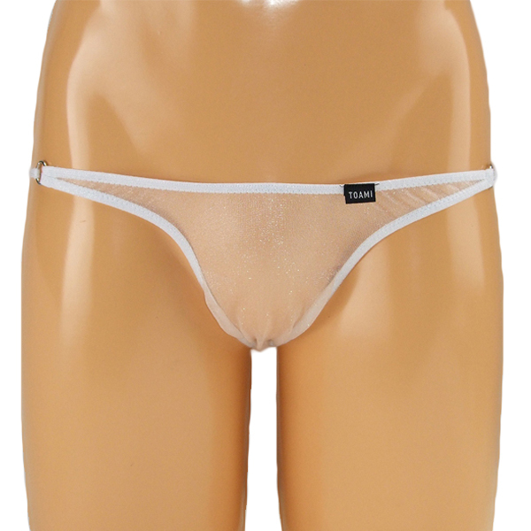 キラキラとした極薄シースルー生地で大胆に魅せるメンズ用オープンショーツ(白)。背面は3本の紐のみで仕立てたオープン仕様で、スケスケの生地と紐をメタルリングでジョイント!ヌードよりもセクシーに決まる日本製オープンショーツ。