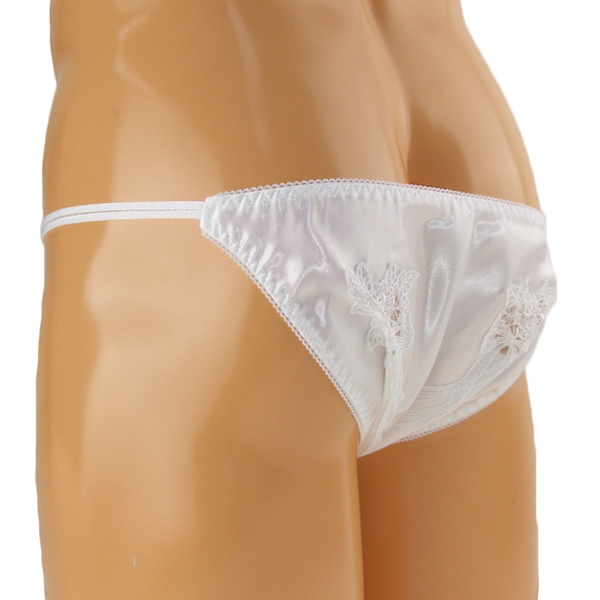上品な光沢と華やかな花柄レースが下半身を美しく飾る♪伸縮性抜群のストレッチ生地を使用した日本製フルバック(白)。前後の花柄刺繍からうっすら見える素肌がセクシーな一枚!女装下着用にぜひ♪