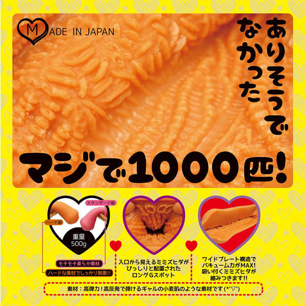 千匹のミミズのヒダが絡み付き刺激するモチっと張りのある高弾力素材の非貫通オナホ(日本製)。