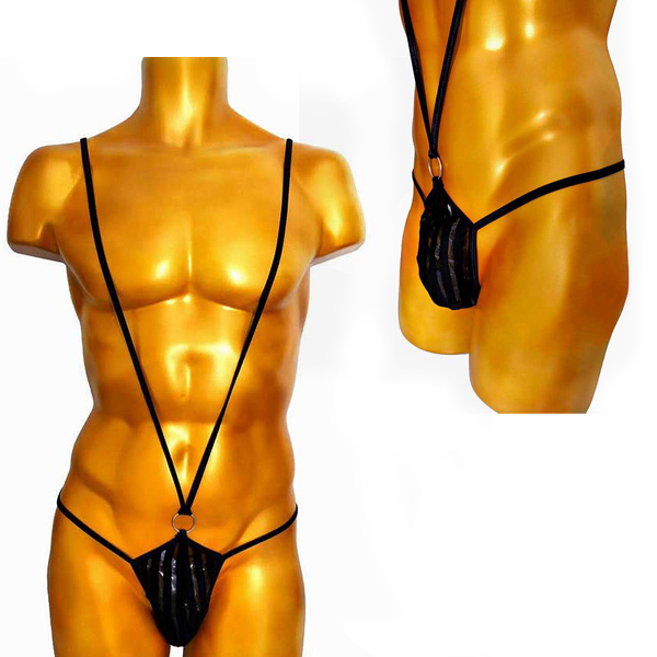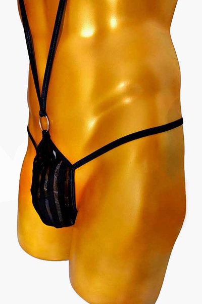 ストライプ状にシアー素材を組み合わせたブラックカラーのメンズ用サック。V字サスペンダーがワイルドな魅力を強調する!フリーサイズ