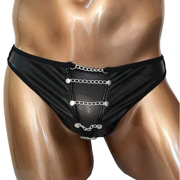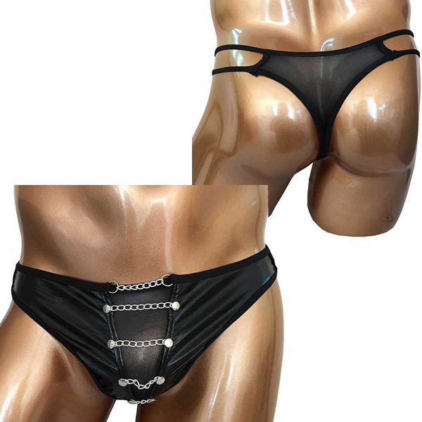 フロントにチェーンを装飾した格好いい男性用タンガ風Tバック。シンボル部分とバックはシアー素材になっており涼し気な印象です♪サイドはお洒落なダブルストリング仕様。ブラックカラー、フリーサイズ