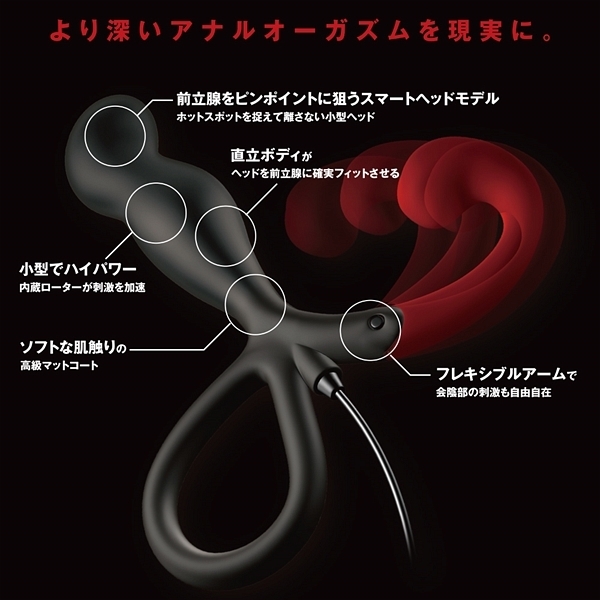 お手軽さが定評の前立腺開発グッズ「エネマブルR」に上級者タイプが登場しました!3段階に可動するアームで会陰部の刺激も自由自在♪12段階の強弱と10種類の振動パターンによる120種類の振動が前立腺を抉り出す!前立腺を刺激するために開発された洗練されたフォルムが悶絶のドライオーガズムへと導く♪3段階に可動するフックで会陰部への刺激も自由自在にお楽しみ頂けます!