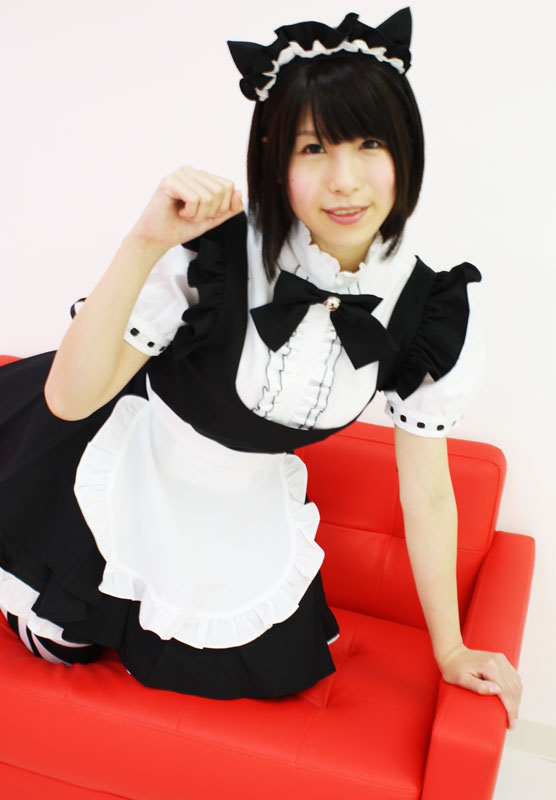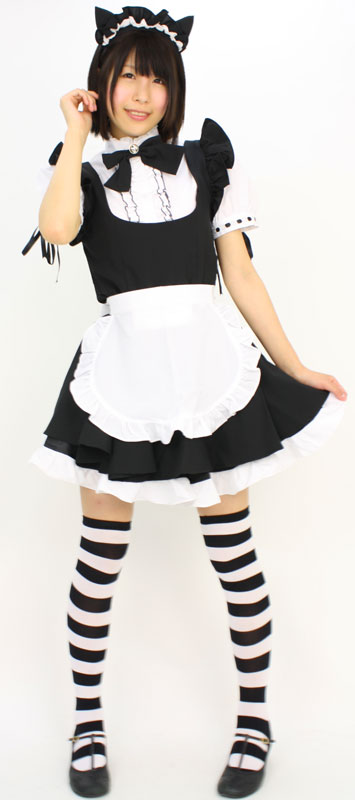 ピンと立ったネコ耳カチューシャ、鈴付きのリボン、ブラウスの袖口にはハシゴレース+リボンも!ミニ丈のメイド服が欲しい方には絶対お勧め!これであなたも可愛いネコメイドさんに変身です。