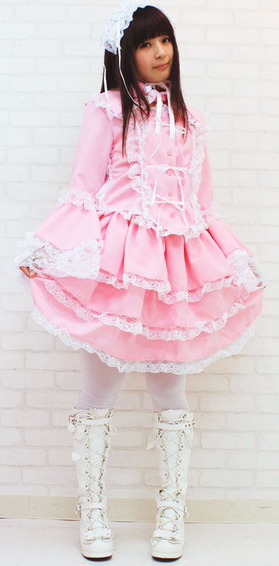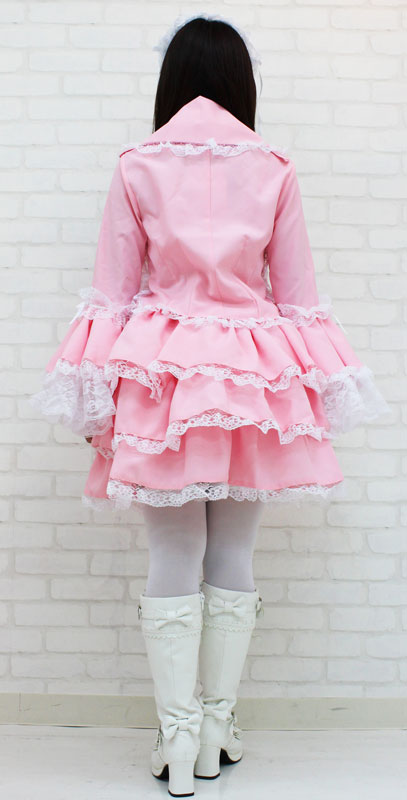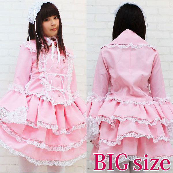 BIGサイズ:B〜100cm・W72〜120cm 丈:上着52cm(袖丈65cm・肩幅40cm)・スカート49cm 付け襟(首回り)43cm セット内容:上着(前ボタン)・スカート(ウエスト部分ゴム、スカート3枚仕立て、裏地付き、チュールパニエ付き)・付け衿(ボタンにて着脱可)・ヘッドドレス