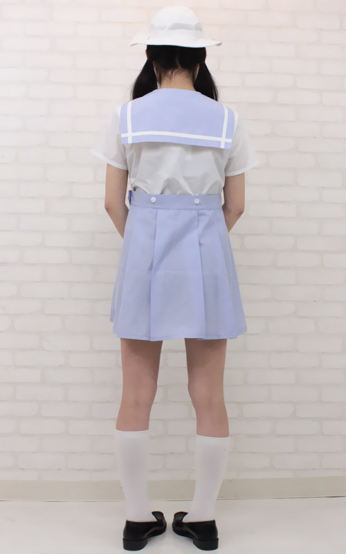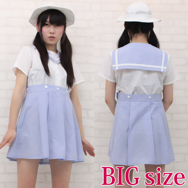 昔懐かしいゴム付き帽子もセット!淡いブルーが爽やかな夏服タイプの制服コスプレ(BIG)。
