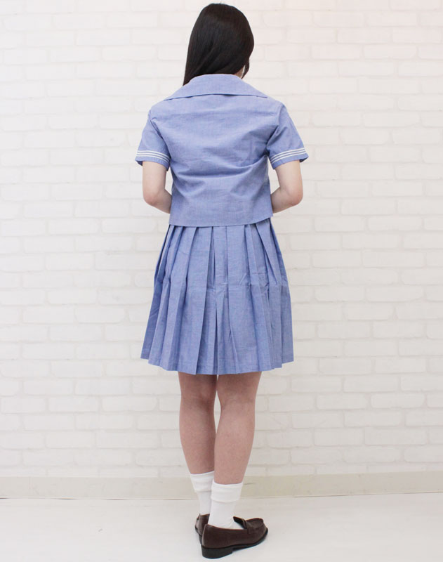 ブルーカラーが爽やかなジャンパースカートタイプの夏服セーラー服(M)。