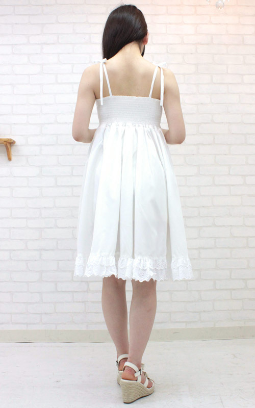 肩紐の可憐なリボン結びや、裾のレースが愛らしい!日焼けした肌にも見事に映えるワンピースは、コーディネイト自在のサマーコスチュームです。