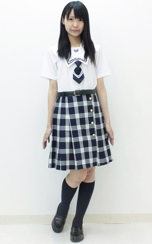 チェック柄のボックスプリーツスカートについた金ボタンがとってもオシャレな夏服仕様の制服コスチューム(ベルト付き)です。