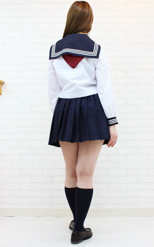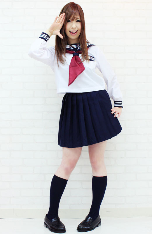 白ブラウス(長袖)とネイビーカラーのプリーツスカート、赤リボンがセットになった本格的なデザインの制服コスチュームです。