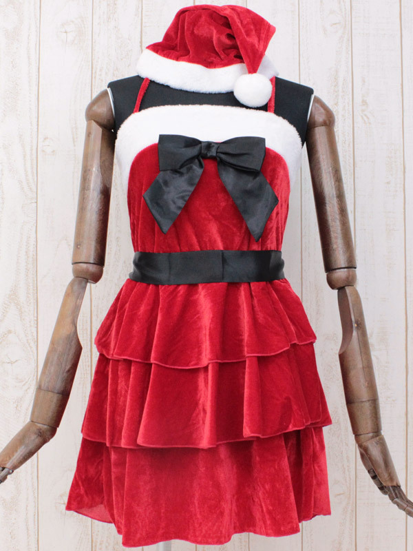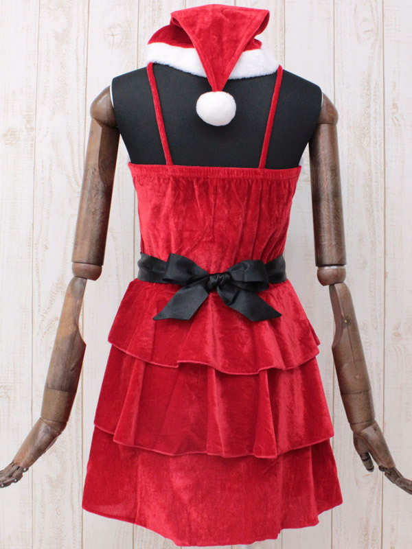胸元リボンが可愛いキャミワンピの腰に、さらにリボンを巻いてウエストマーク!ふんわり広がるティアードワンピースのキュートなサンタ衣装です。
