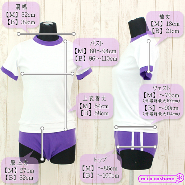 BIGサイズ B96〜110cm・W〜90cm(伸縮時最大114cm)・H〜100cm 上衣:着丈58cm・肩幅39cm・袖丈21cm ブルマ:股上丈32cm セット内容:上衣、ブルマ 素材:ポリエステル65%、コットン35%