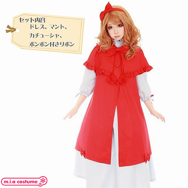 レースやリボンを施した長めの真っ赤なマントやボンボン付のリボンがとってもキュート♪可愛いハロウィン仮装をお探しの方はぜひどうぞ!カチューシャ付き