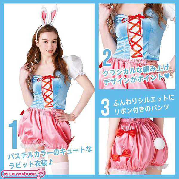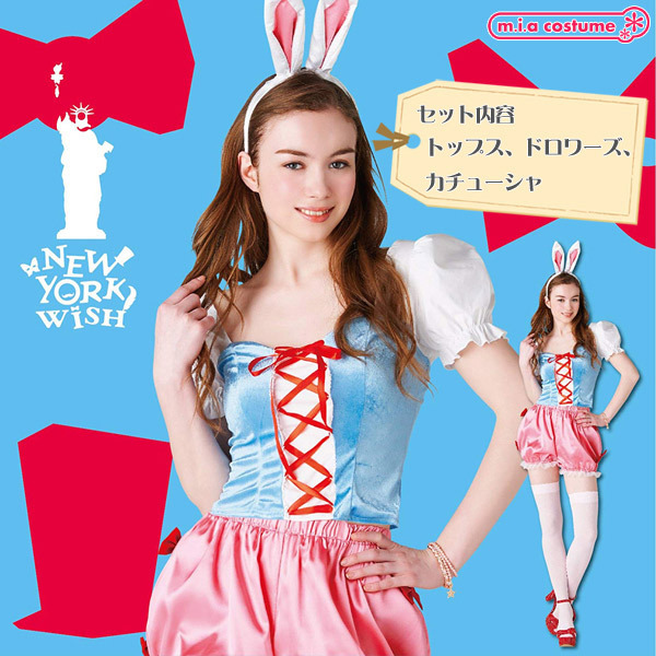 人生をワクワクさせるコスプレブランド「Newyork Wish」から登場!お尻に丸く真っ白な尻尾が付いたドロワーズのサイドに真っ赤なリボンを2つ飾り付け、パステルカラーで華やかに仕上げた兎カチューシャ付きのハロウィン仮装。