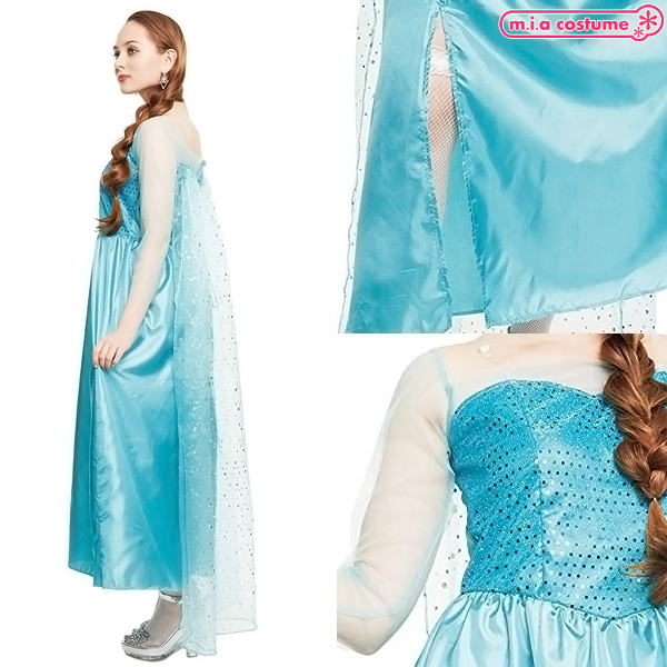 涼し気なブルードレスとオーガンジーマントで雪の女王になりきり変身!あの人気プリンセスを彷彿とさせるオフショル仕様のワンピースドレス。