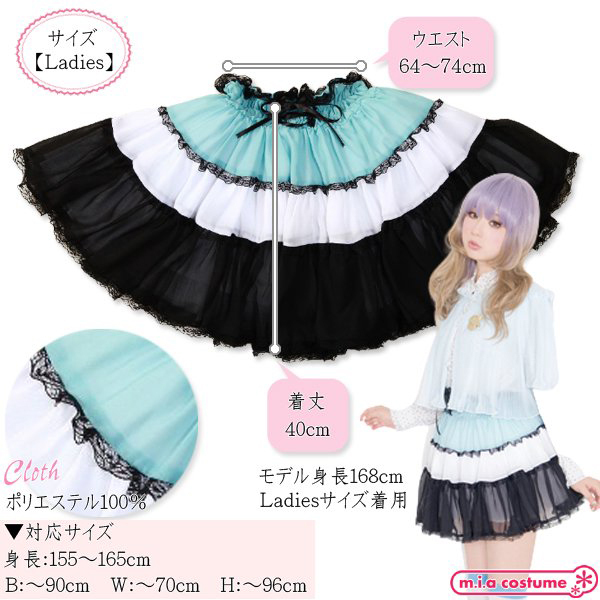 対応サイズ:身長155〜165cm・B〜90cm・W〜70cm 実寸:W64〜74cm・着丈40cm セット内容:パニエ単品(ウエストゴム) 素材:ポリエステル100% モデル身長168cm