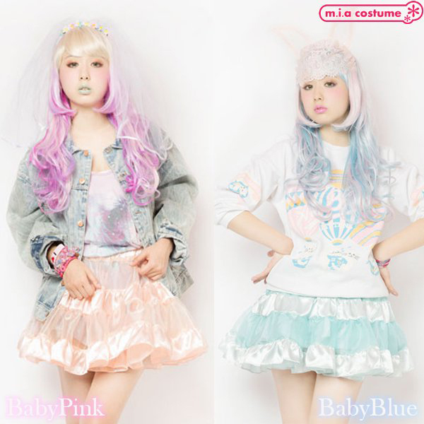 イベント用衣装やパーティーコスプレとしても良さげ♪原宿系カリスマモデル「AMO」がプロデュースする新ブランド「LUNATICLEMONYLOLLIPOP」からティアードスカート(ベビーブルー)が登場!サテンの光沢感とシースルー素材の組み合わせが可愛くて、重ねるボトムスで様々なコーディネイトが楽しめる逸品です。
