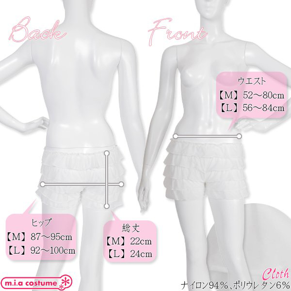 Mサイズ W52〜80cm・H87〜95cm・総丈22cm セット内容:ペチコートパンツ単品(ウエストゴム) 素材:ナイロン94%、ポリウレタン6% モデル身長162cm