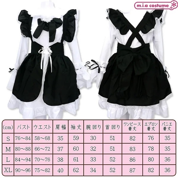 XLサイズ:B90〜96cm・W75〜82cm・肩幅40cm・袖丈62cm・腕周り34cm・首周り52cm・着丈(ワンピース87cm、エプロン82cm、パニエ約36cm)・帽子頭周り55cm セット内容:胸リボン付きワンピース、編み上げリボン付きエプロン、パニエ、コサージュ、カチューシャ、帽子