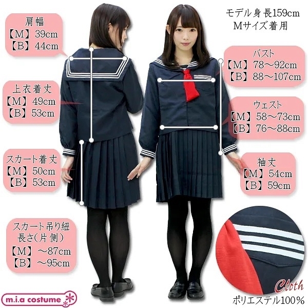 BIGサイズ:B88〜107cm・W76〜88cm・肩幅44cm・袖丈59cm・着丈(上衣53cm、スカート53cm)・吊り紐の長さ(片側)〜95cm セット内容:上衣(前開きボタン留め)、吊りスカート(横ファスナー、アジャスター調整可)、タイ 素材:ポリエステル100%