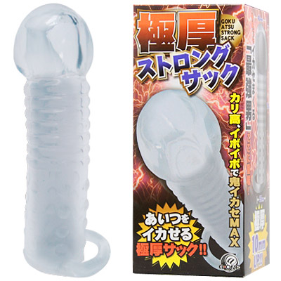 「極厚ストロングサック」があなたの男根を1.5倍に引き締め、イカせまくる快感を味わえます♪肉厚樹脂により感度を鈍らせ、持久力UPはもちろん、カリ高ヘッド・凹凸・イボイボがパートナーをメロメロにします。