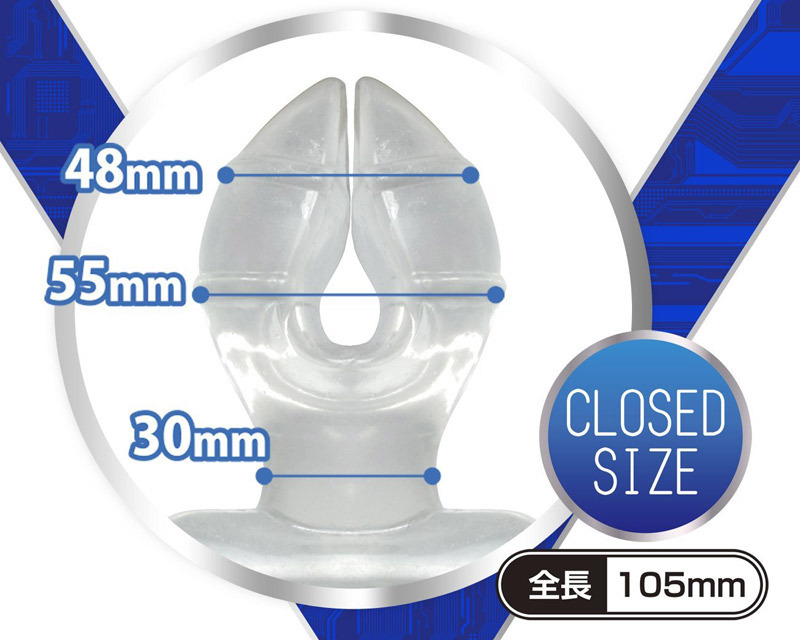 ●クリアカラーのハード素材採用●ずっしり重量級の圧迫感●最大幅:約5cm超(閉口時)・約9cm超(開口時)●二股形状で腸壁を押し広げながら刺激。
