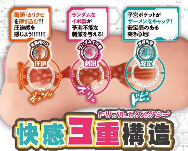 入り口から搾るようにぎゅんっと圧迫!中腹ではランダムイボが不規則な刺激を与え、最奥の子宮ポケットで精子をたっぷり飲み込む快感三重構造♪重量315g、底圧仕様で安定感のある突き心地を体感!女性のアソコを研究して作り上げたリアル造形の非貫通オナホ。