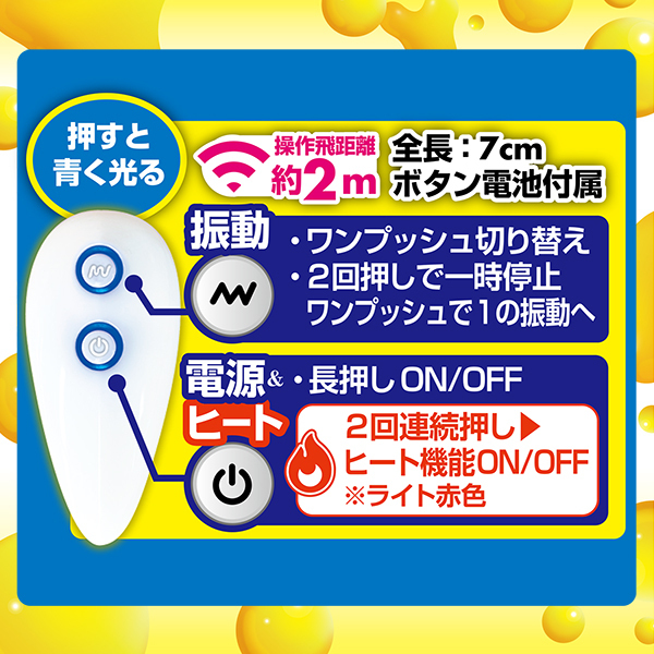 下着に仕込んでお散歩&お仕置きプレイにもオススメ♪動かさずに挿れっぱでLet’sイキっぱ!!!・ヒート機能付き・リモコン付属(操作飛距離約2m)・生活防水・USB充電式(充電時間:約120分/連続使用時間:約45分)