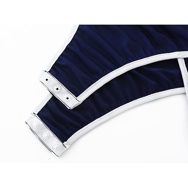 ジャージをモチーフにした、遊び心たっぷりのコスチュームです♪トラディショナルな紺×白の配色に、2本ラインがアクセントになっています!ハイネックと長袖の組み合わせで、一見クラシックな印象です♪しかしフロント部分は大きくくり抜かれ、前衛的なデザインに仕上がっています!レオタード型のオールインワン仕様で、すっきりとしたシルエットです♪ハイレグカットが脚元をスタイリッシュに見せてくれます!クロッチ部分にはスナップボタンがあり、実用性にも配慮されています♪ユニークで個性的な一着を楽しみたい方におすすめです!