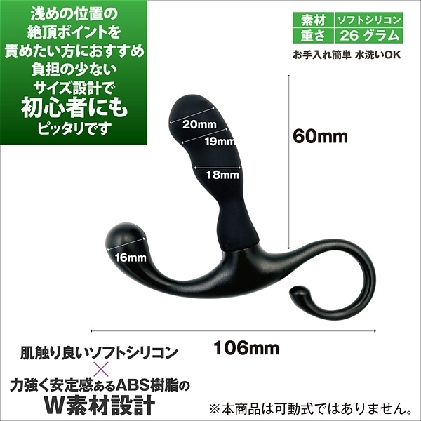 パッケージ:17.8×13.5×3.0cm 本体:挿入部6.0×1.8〜2.0cm 素材:ソフトシリコン&ABS樹脂 重量:30g