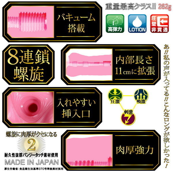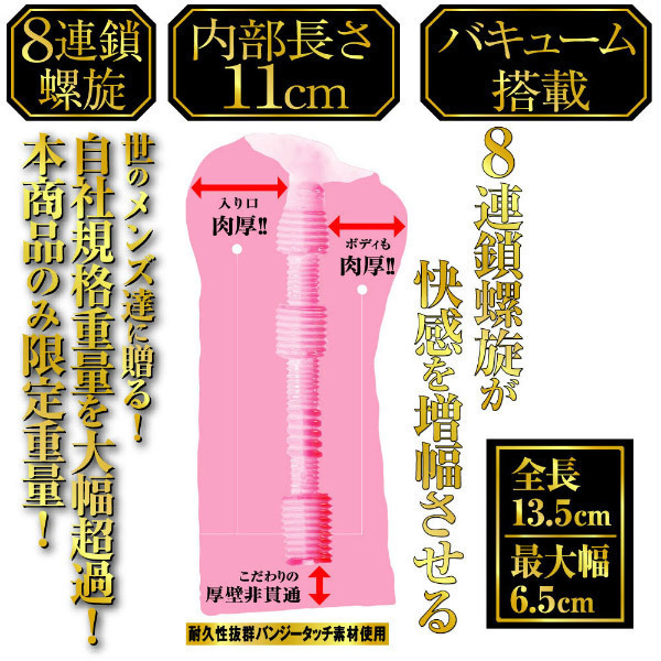 前作同様、バンジータッチ素材を採用したボディは、内部の長さを11cmに延長しました!内部構造はゾリゾリとした8連鎖のヒダ螺旋!ぎゅぎゅっと締め付けるバキューム力の増した「ずっ尻」オナホールで、クセになる快感をお楽しみ下さい。