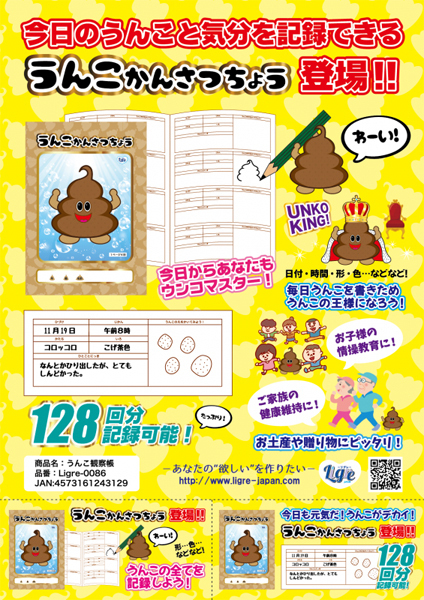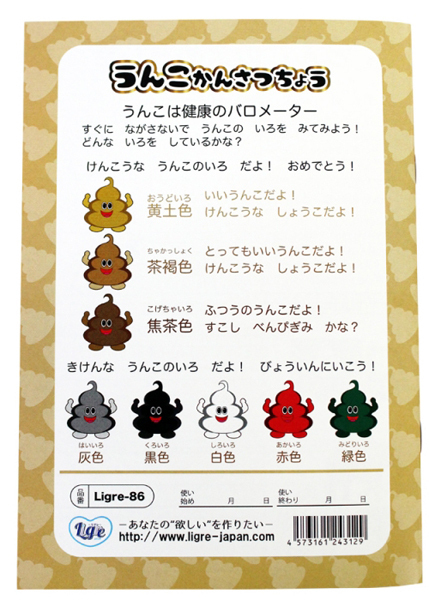 毎日の体調管理にうんこ日記をつけよう!日付、時間、うんこの形や色などの状態管理用の項目のほか、ひとこと日記など一冊で128回分の記録が可能♪夫婦やカップルさん、家族みんなが毎日元気でいるために。今日からうんこ日記を始めよう!