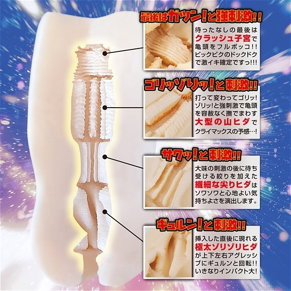 まさに時空回転!極太のヒダが回転し、そして絞りにうねり、最後はクラッシュ!時空回転「スペースバンプス」の登場です!この造形!まさに無敵!超快感の極太ゾリゾリヒダが左右上下に回転!間に絞りを入れながらも細かい尖がりヒダで超ゾリゾリ体験!さらには亀頭を撫でまわすような山ヒダにゾリゾリ造形!待ったなしの最後はクラッシュ子宮で即イキ確定!こんな贅沢すぎるオナホが今まであっただろうか!?最初から最後まで快感が上り詰める!ピストン運動でアナタは宇宙を体験するだろう!これはオナホのブラックホールだ!!