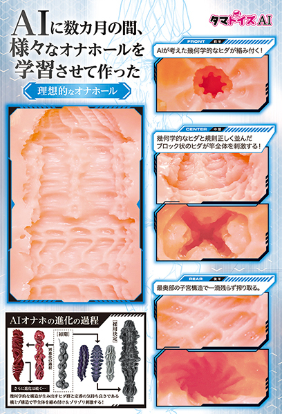 AIが考えた幾何学的なヒダが絡みつく内部構造には規則正しく並んだブロック状のヒダも備わっていて、最奥部には子宮構造もあり一滴残らずあなたの精を搾り取ります!匂いも控えめで弾力のあるフレキシブルスキンを使用!適度な粗さが引っ掻く感触を抑え、粘膜感のある刺激が不思議な気持ちよさを味わわせてくれます♪高弾力・高伸縮素材でヒダメイン!パッケージイラストも内部構造もAIが考えて作られています。