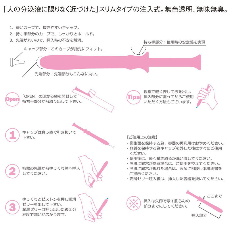 人の分泌液に限りなく近づけた「プレペア」は、無色透明・無味無臭で違和感のないナチュラルな使い心地!個別包装のスリムな注射器型で、スルッとワンタッチの簡単挿入が可能!手を汚さず衛生的にお使い頂けます。