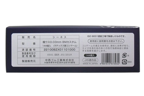 中西ゴムの国産コンドーム「極ウス0.03」144個入り。